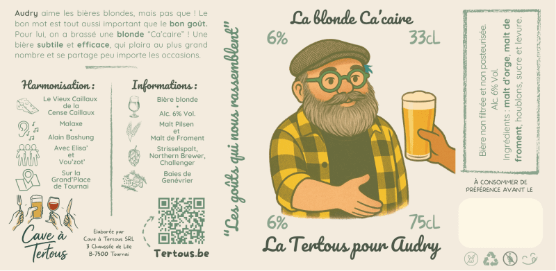 Audry aime les bières blondes, mais pas que ! Le bon mot est tout aussi important que le bon goût. Pour lui, on a brassé une blonde “Ca’caire” ! Une bière subtile et efficace, qui plaira au plus grand nombre et se partage peu importe les occasions.