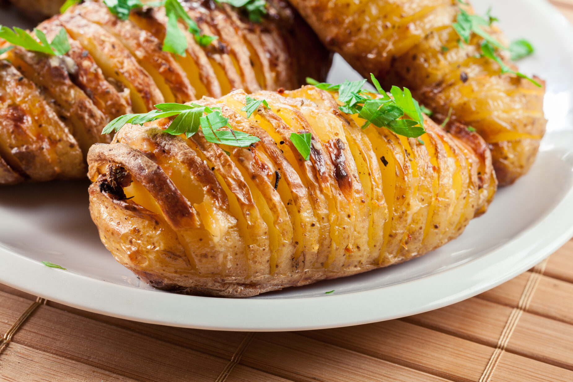 3. Entaillez chaque pomme de terre dans le sens de la largeur à intervalles réguliers, à +/- 5/8 mm, en veillant à ce qu’elles restent intactes.