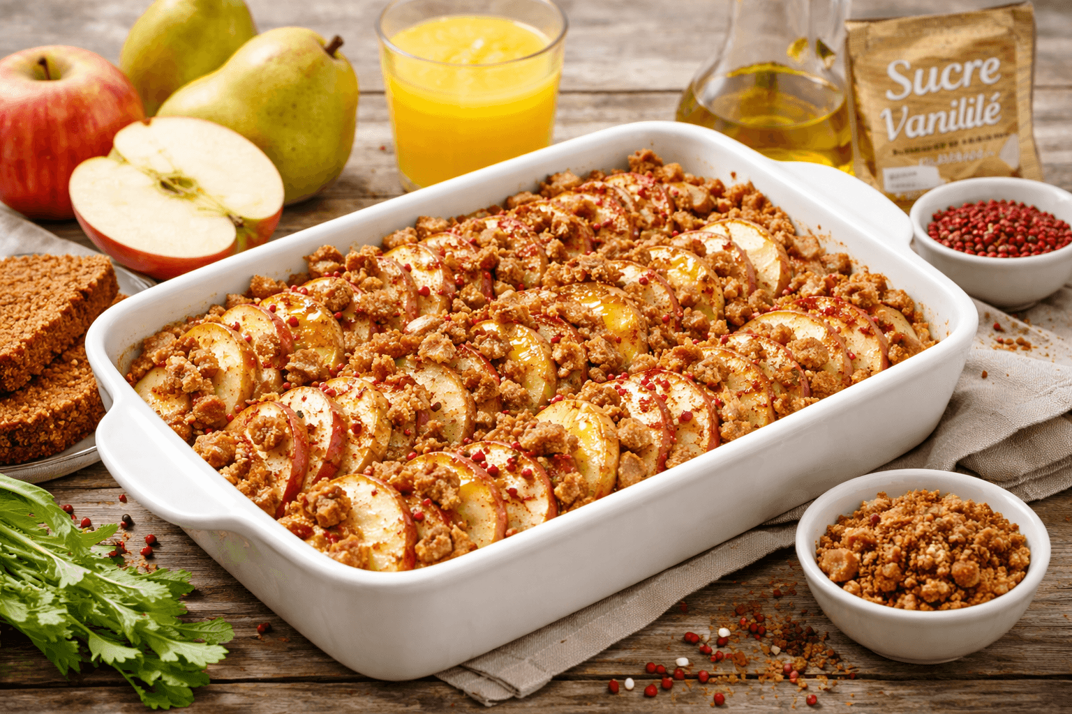 - Parsemer le plat de pain d’épices émietté et poursuivre la cuisson 5 minutes.