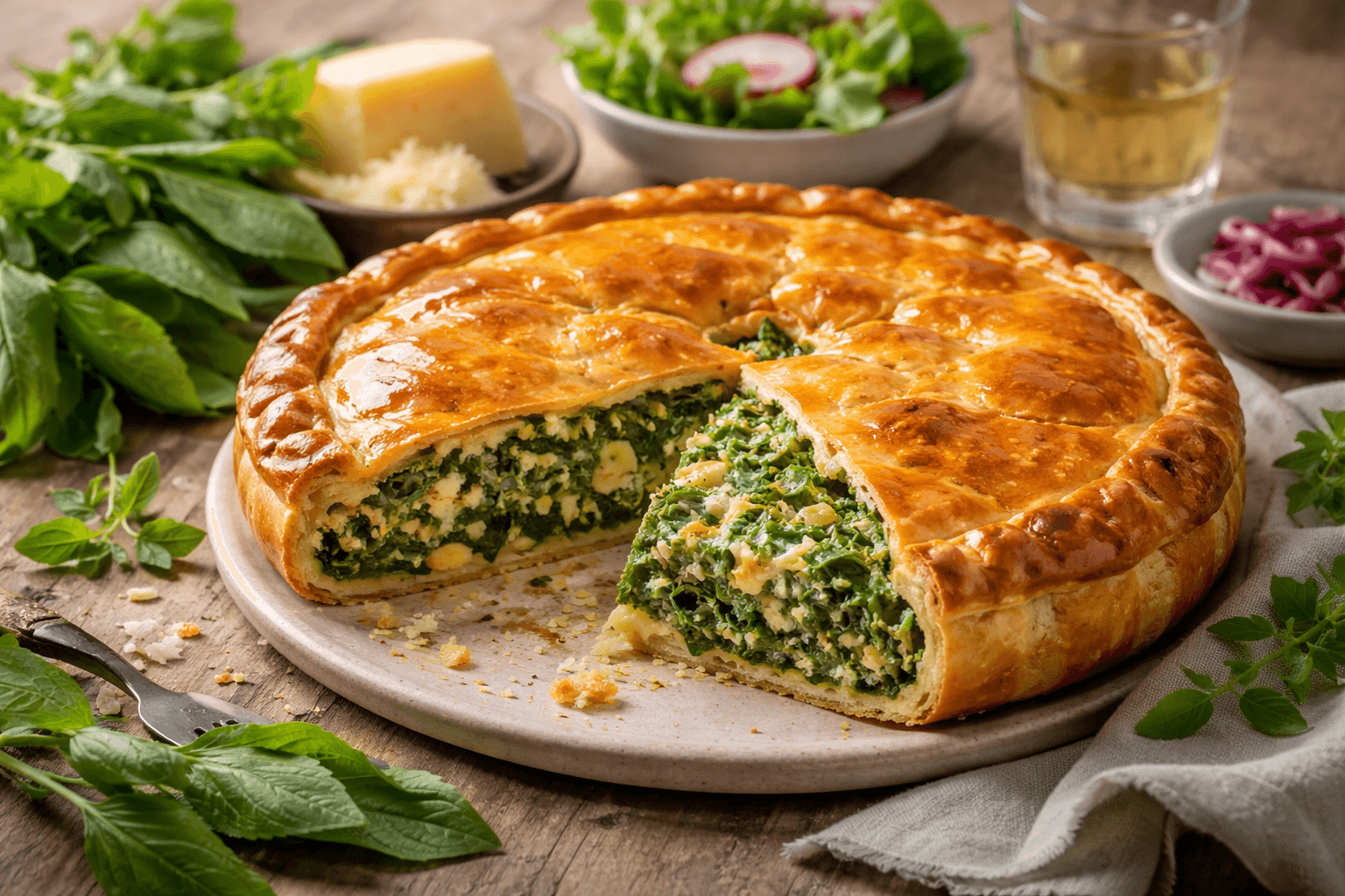 Servir la tourte découpée en parts épaisses, accompagnée d’un bouquet de jeunes herbes fraîches (persil plat, ciboulette). Pour une présentation plus contemporaine, ajouter un filet d’huile de colza toastée autour de l’assiette.